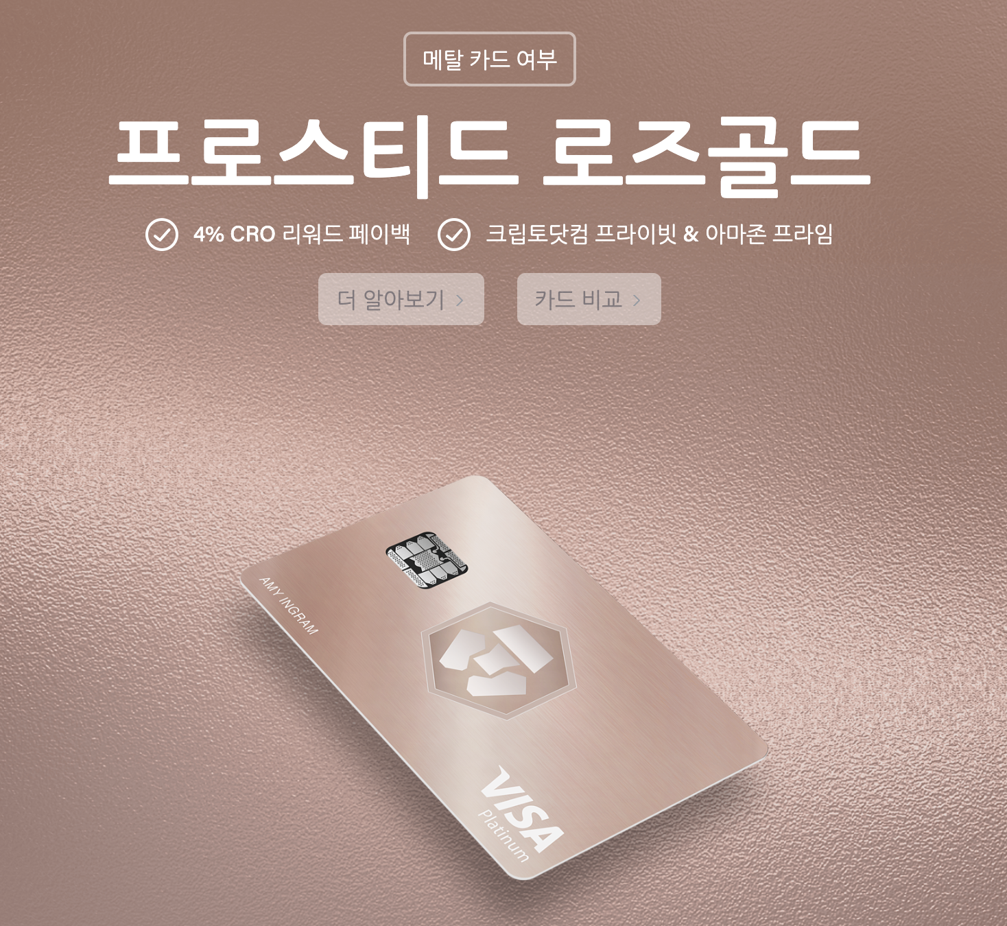 다음 등급은 이전 등급 대비 10배의 비용인 100,000 CRO (약 2,000만원) 를 스테이킹 시 신청할 수 있는 프로스티드 로즈 골드와 아이시 화이트 카드 입니다.