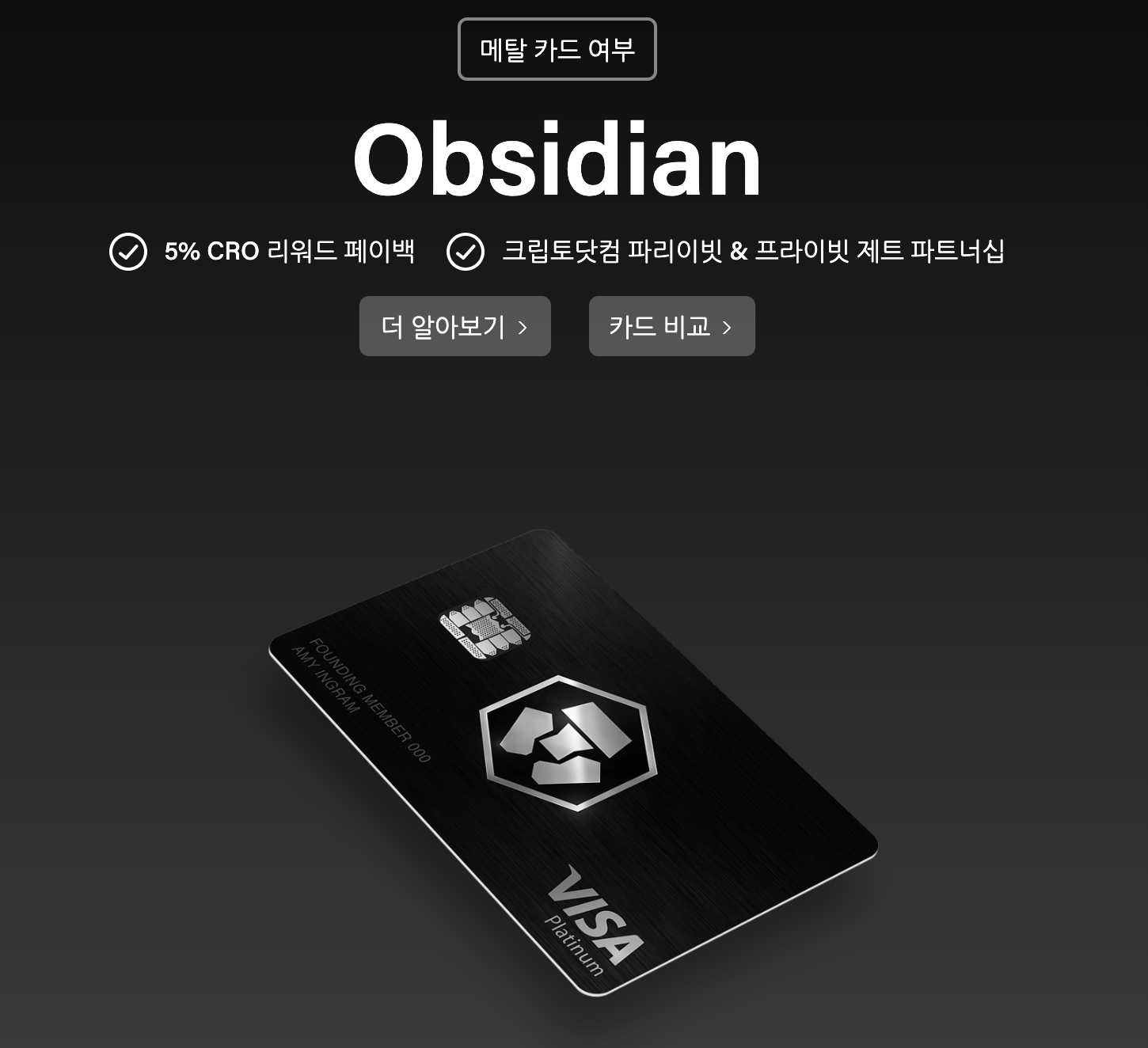 MCO 카드 라인업 중 최상위 등급인 옵시디언(Obsidian) 등급은 블랙 컬러의 티타늄 카드를 지급하며 이를 받기 위해서는 1,000,000 CRO 를 구입하여 스테이킹(Staking) 하셔야 합니다.