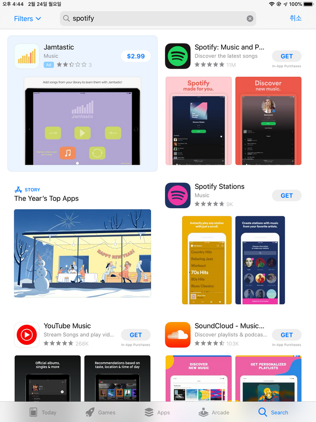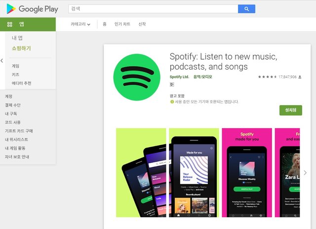 구글과 애플에서 미국계정으로 스포티파이를 검색한 결과입니다.