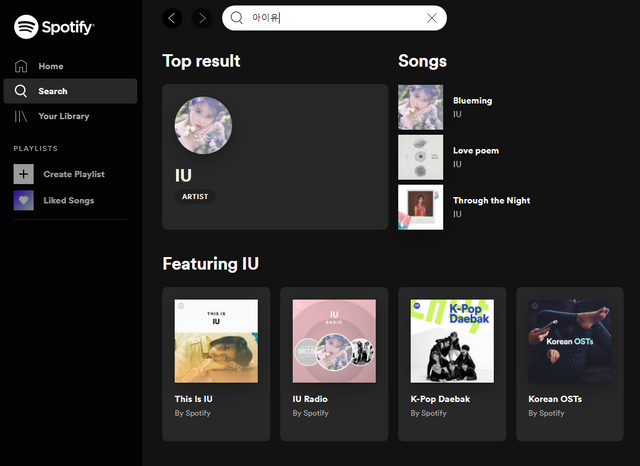 한글 검색도 잘되고 한국 최신 음원들도 왠만한 건 이미 다 등록되어 있습니다.