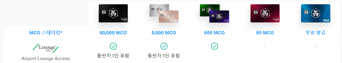 일단 MCO 카드들 중 무료로 발급되는 미드나잇 블루 와 50MCO 스테이킹 조건인 루비 스틸은 해당 혜택을 받을 수 없습니다.