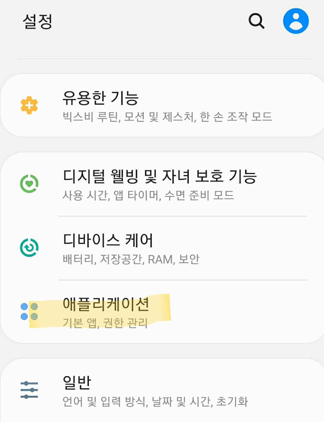 MicroG 삭제 시와 동일하게 우선 설정 -> 애플리케이션 메뉴로 들어가서 MicroG 를 검색 한 후 저장공간 메뉴로 들어 갑니다.