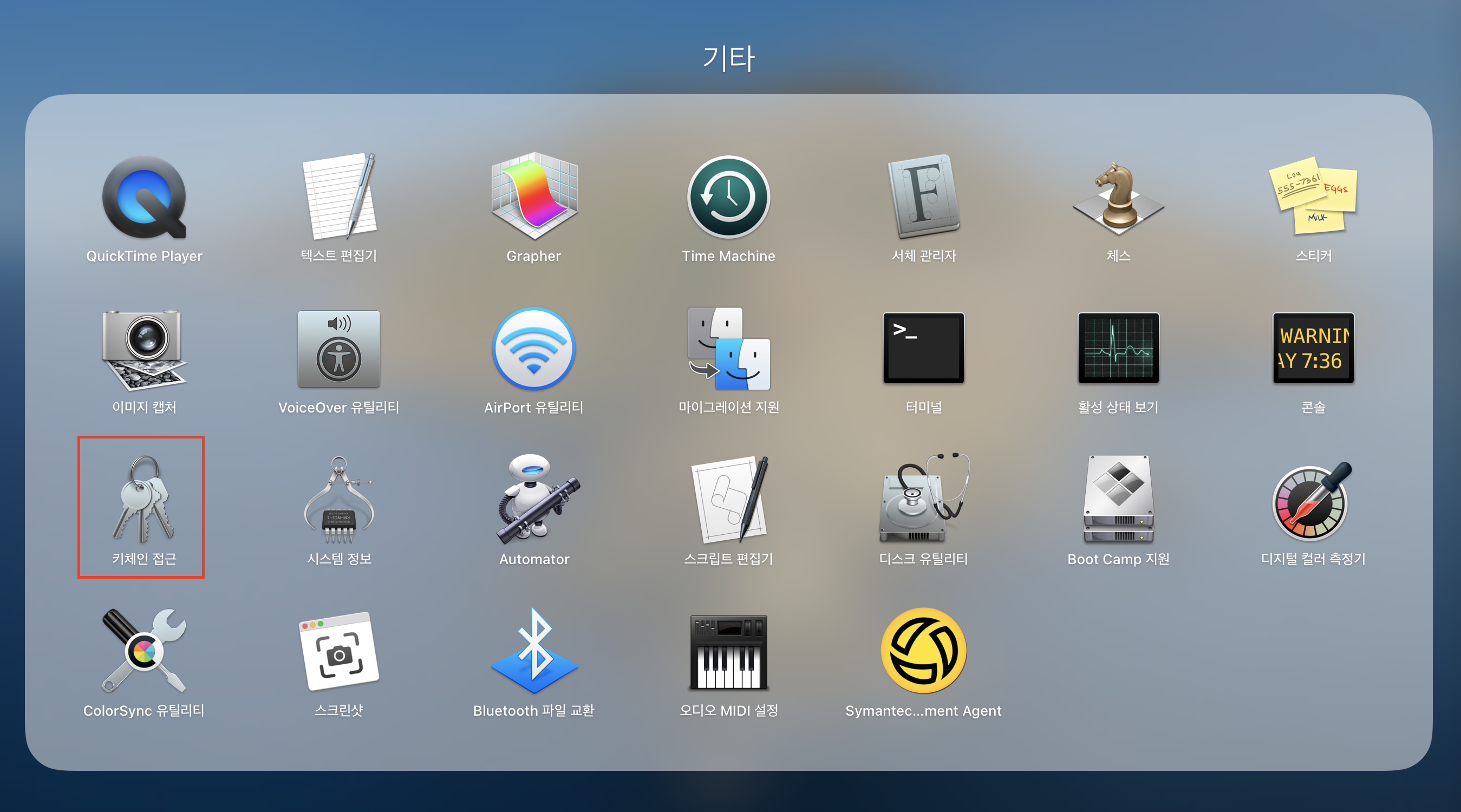 런치패드를 띄운 후 기타 폴더를 선택하고 위 스크린샷에 표시된 키체인 접근 을 실행 한다.