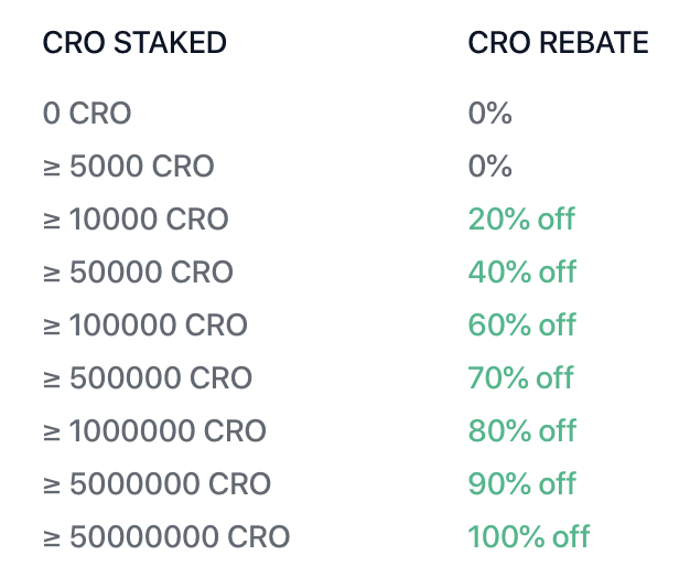 CRO 를 스테이킹 하고 거래 수수료를 CRO 로 지불할 경우 스테이킹 수량에 따라 최대 100% 까지 수수료를 돌려줍니다.