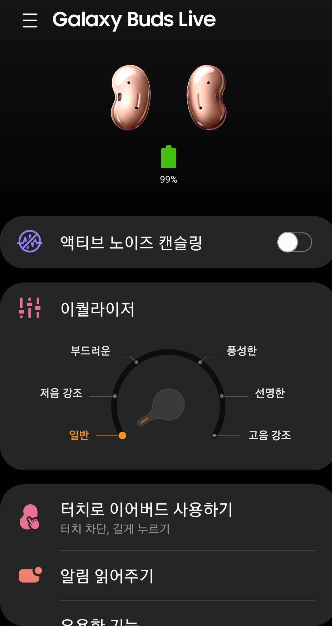 페어링이 끝나고 나면 액티브 노이즈 캔슬링(ANC) 의 ON/OFF 와 이퀄라이저, 터치 설정 및 기타 여러 기능들을 컨트롤 할 수 있습니다.