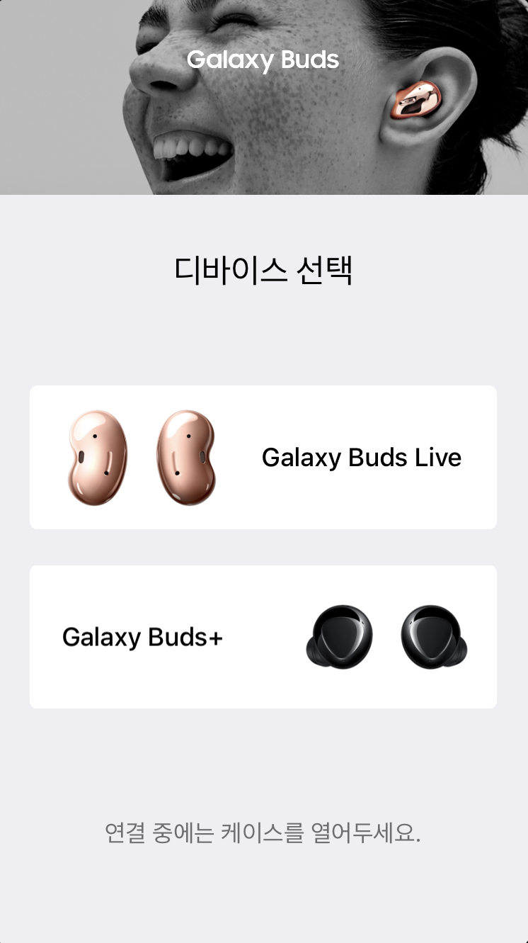 페어링을 위한 디바이스 선택 메뉴에서도 갤럭시 버즈 플러스와 갤럭시 버즈 라이브 두 제품만 보입니다.
