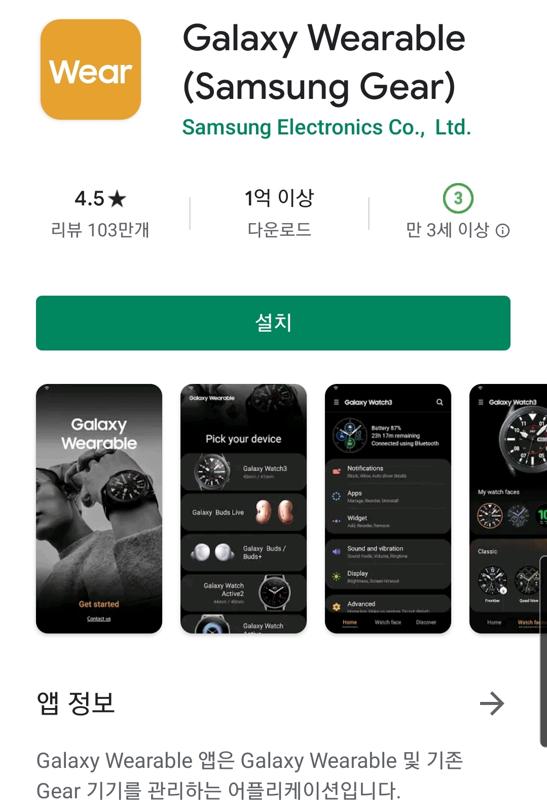 안드로이드와 IOS 모두 앱이 제공되고 있는데 그 중 안드로이드 기기는 갤럭시 웨어러블(Galaxy Wearable) 이라는 앱을 플레이 스토어에서 검색해 설치하셔야 합니다.