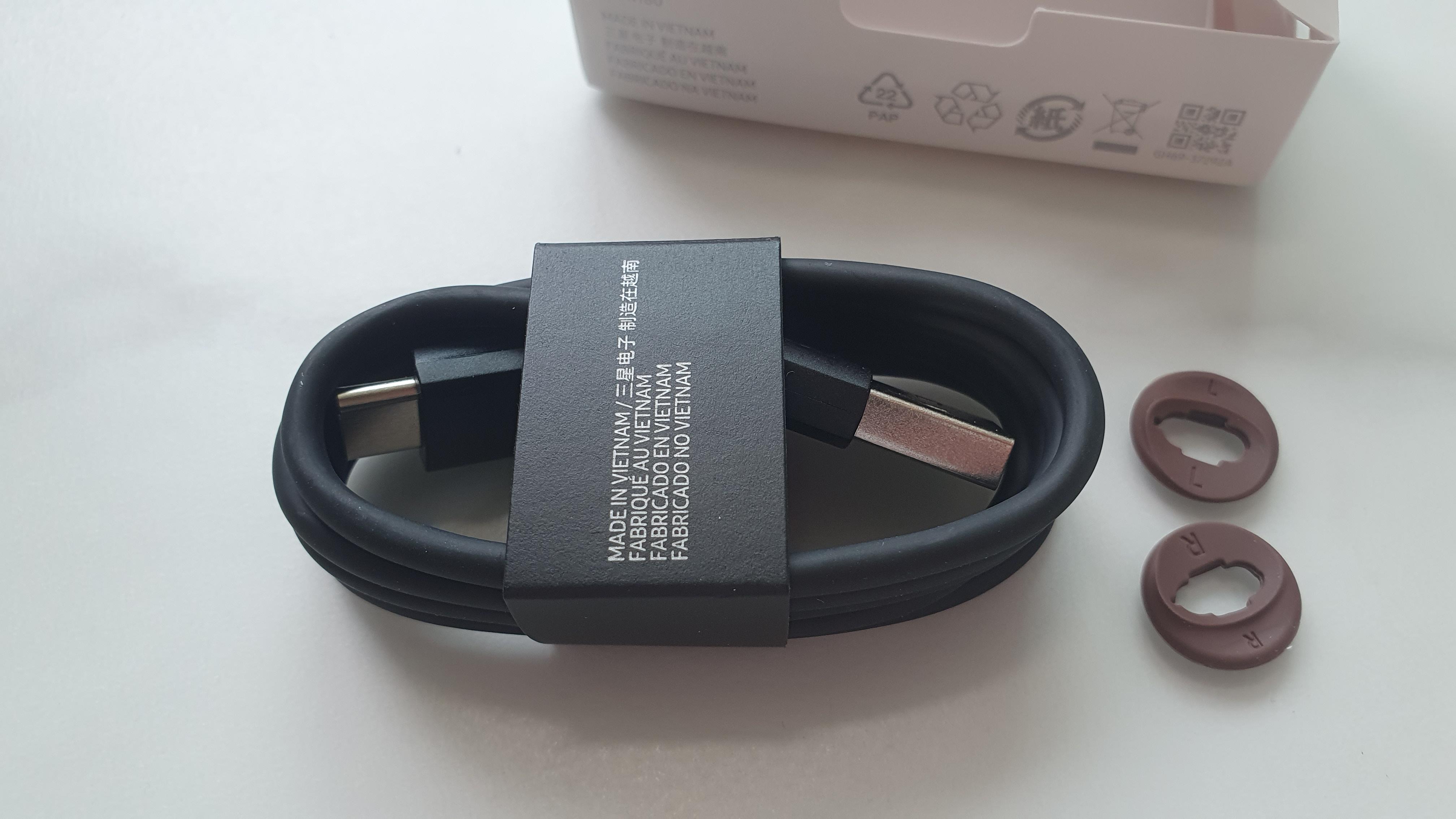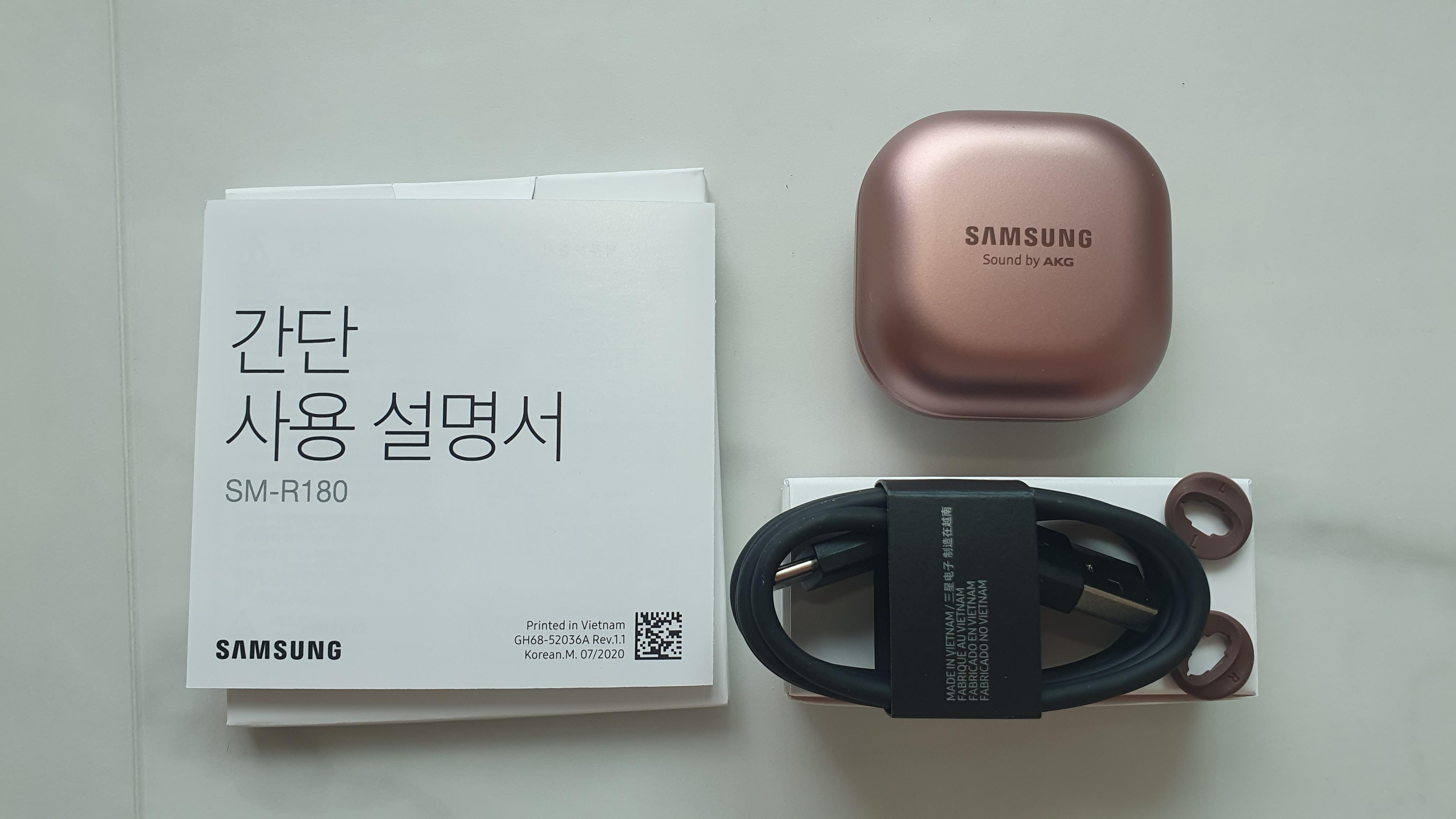 상자를 열면 위와 같이 뚜껑 쪽에 매뉴얼 페이퍼가 들어있는 종이 상자가 크기에 맞게 딱 끼워져 있고 반대쪽엔 갤럭시 버즈 라이브(Galaxy Buds Live) 충전 케이스와 그 아래에 충전케이블, 추가 이어팁이 들어 있는 상자가 끼워져 있습니다.