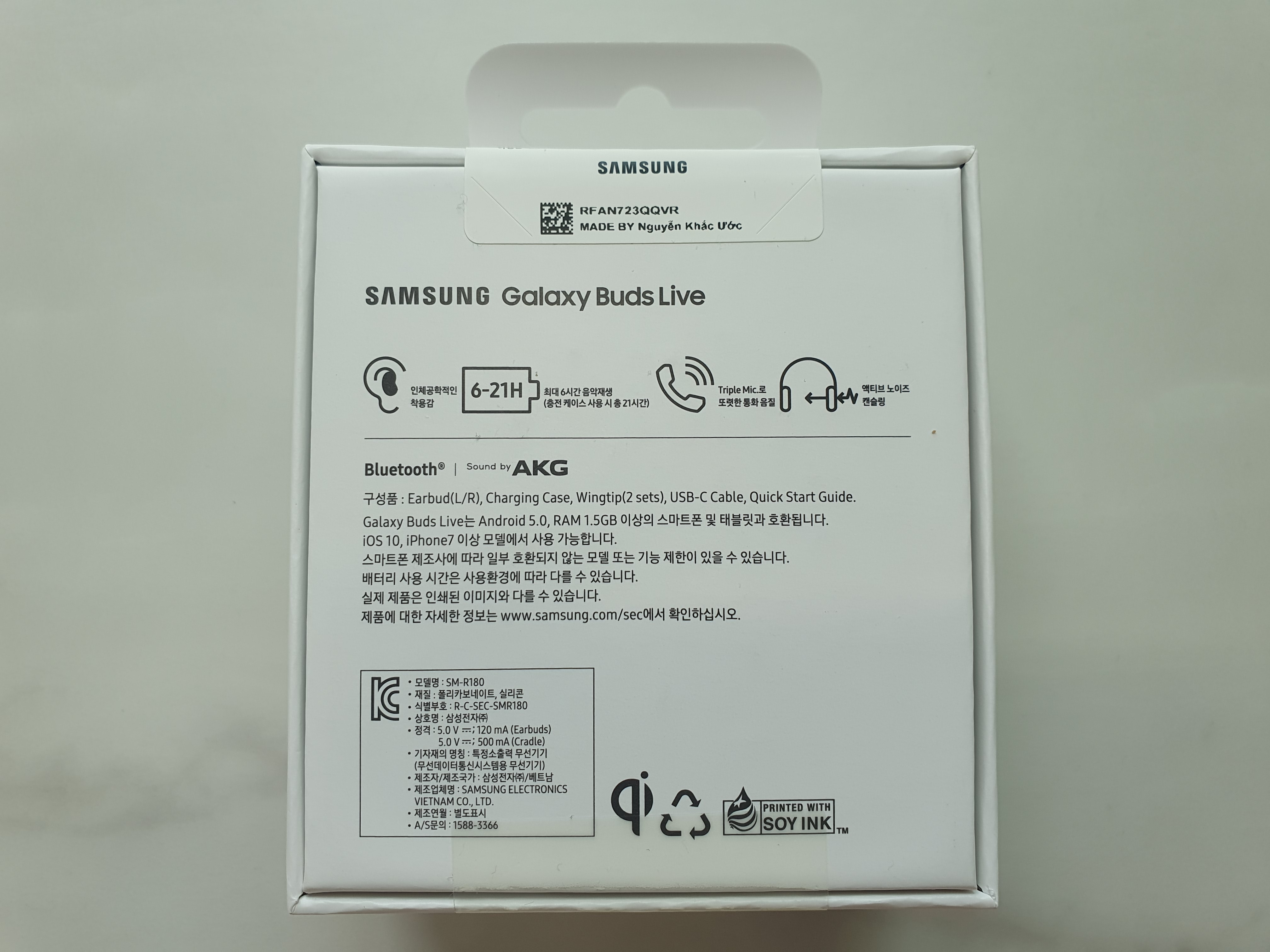 갤럭시 버즈 라이브의 패키지 디자인은 미니멀한 흰색 종이 박스에 Buds Live 라는 타이틀과 함께 제가 선택한 미스틱 브론즈 색상의 이어버드 한쌍이 각도에 따라 빛이 반사되는 형태로 인쇄되어 있습니다.