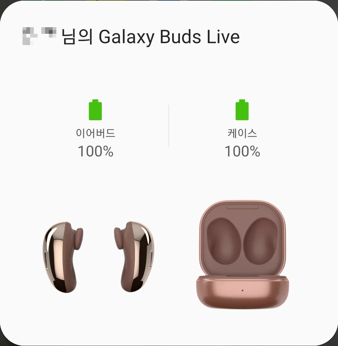 이후 갤럭시 버즈 라이브를 연동 해제 했다가 제 연동 하게 되면 이처럼 이어버드와 케이스의 배터리 상태를 짧은 애니메이션과 함께 팝업 형태로 보여줍니다.