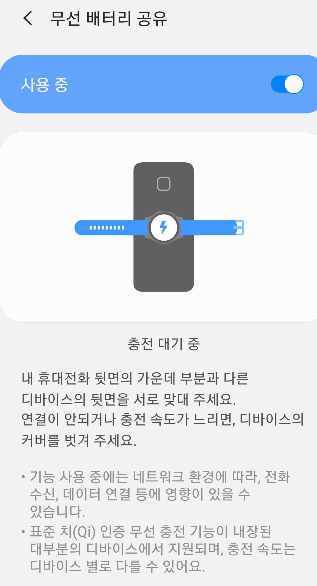 설정에서 배터리 공유를 On 으로 바꾸고 본체 후면에 기기를 올려 놓으면 되죠.