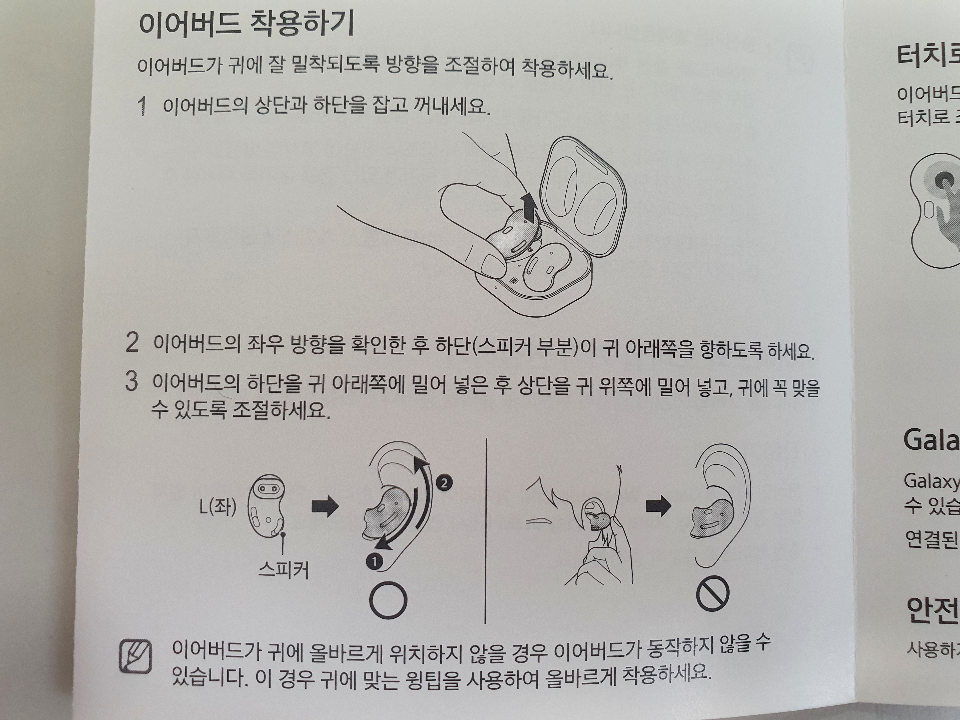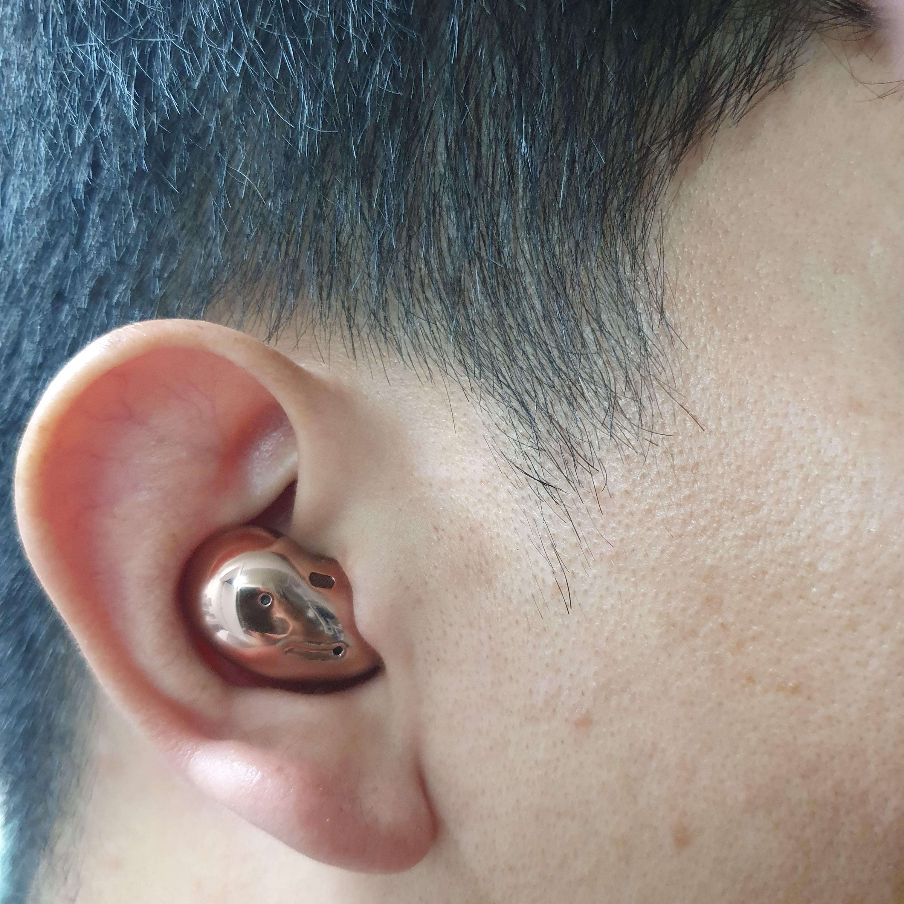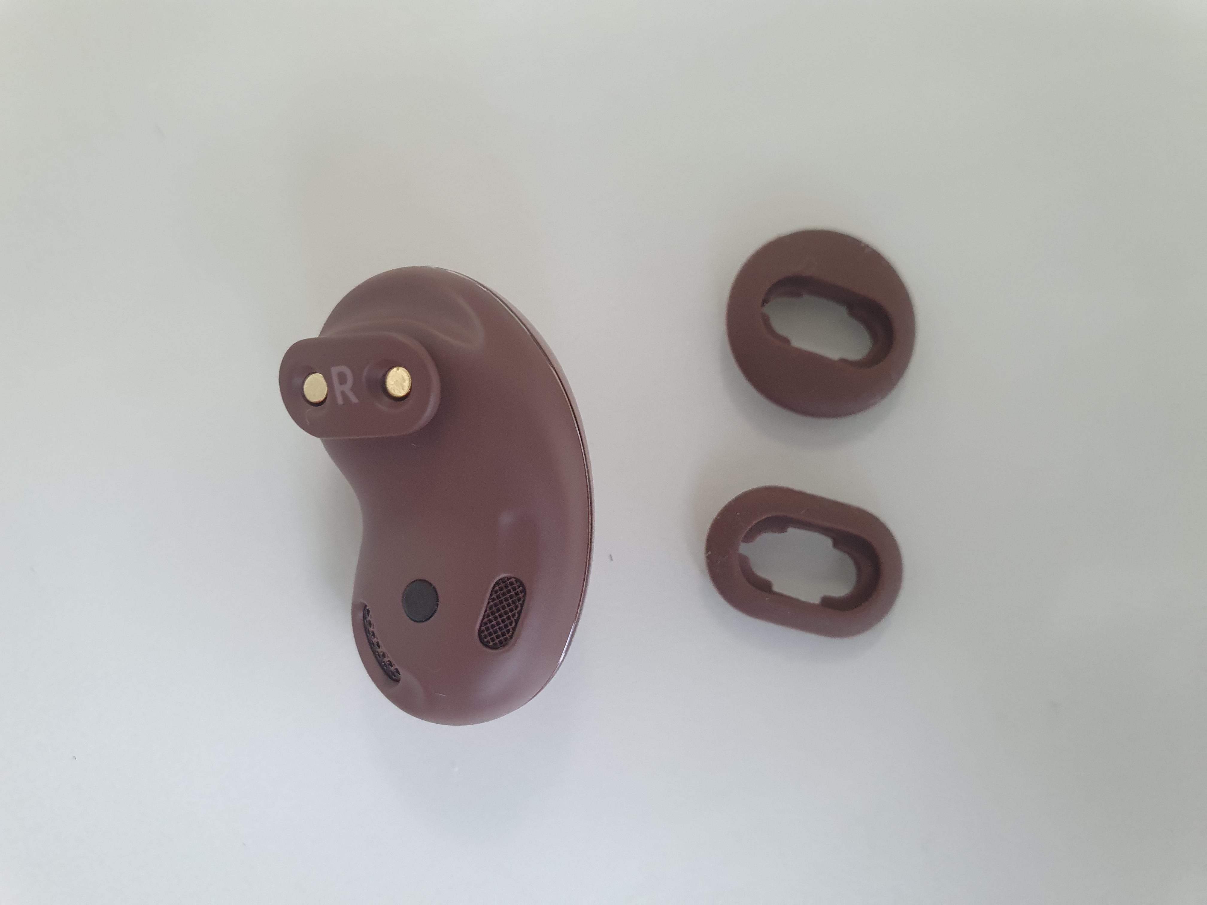 일반적인 이어폰의 경우 고무 이어팁이 귓구멍 속으로 들어가는데 반해 오픈형이 갤럭시 버즈 라이브(Galaxy Buds Live)는 이어버드 하단의 스피커 부분이 귓구멍에 위치하고 고무 이어팁은 귓구멍 위의 귓바퀴 홈에 끼워져 이어폰이 빠지지 않게 고정하는 역할을 합니다.
