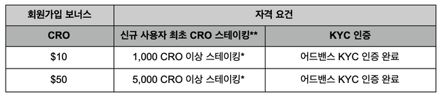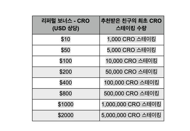 1,000 CRO 와 5,000 CRO 스테이킹의 경우 가입자와 동일한 리워드를 받지만 최대 5백만 CRO 스테이킹까지 추가 조건이 있어 이 경우 무려 2,000 달러 상당의 리워드도 받을 수 있습니다.