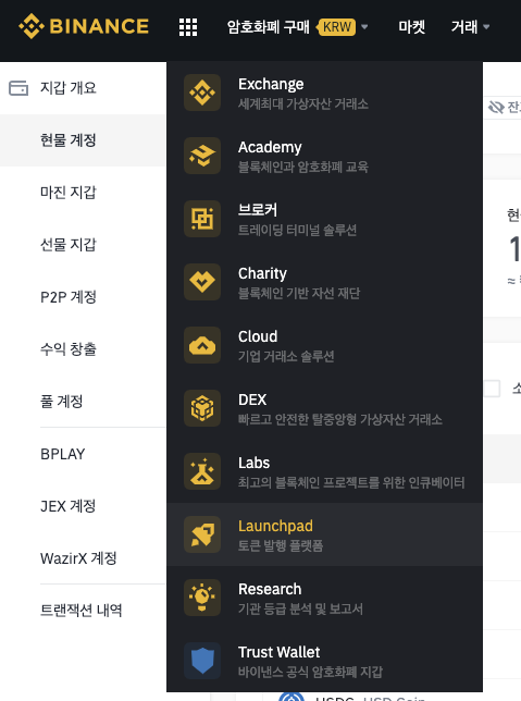 먼저 바이낸스 UI 의 더보기를 누른 후 Launchpad 메뉴를 선택 합니다.