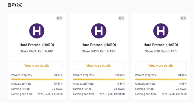 최근 완료된 HARD 런치풀의 경우 ETH 대신 KAVA 풀이 열렸었는데 아무래도 이더에 비해 홀더가 훨씬 적다보니 APY 가 무려 75%를 상회했었습니다.