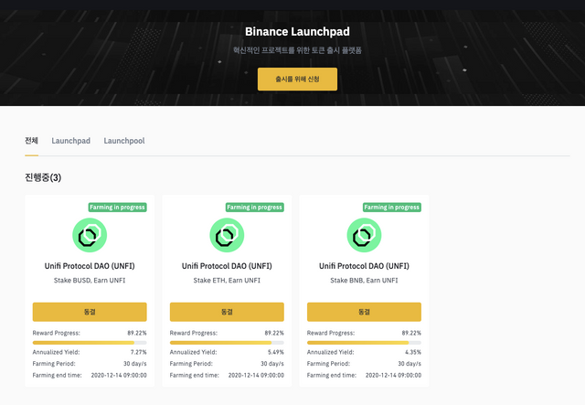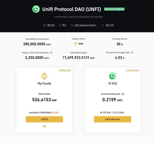 현재 유니파이의 경우 UI에 보이는 순서대로 각 풀당 수익률(APY) 는 BUSD : 7.27% / ETH : 5.49% / BNB : 4.35% 를 보이고 있습니다.
