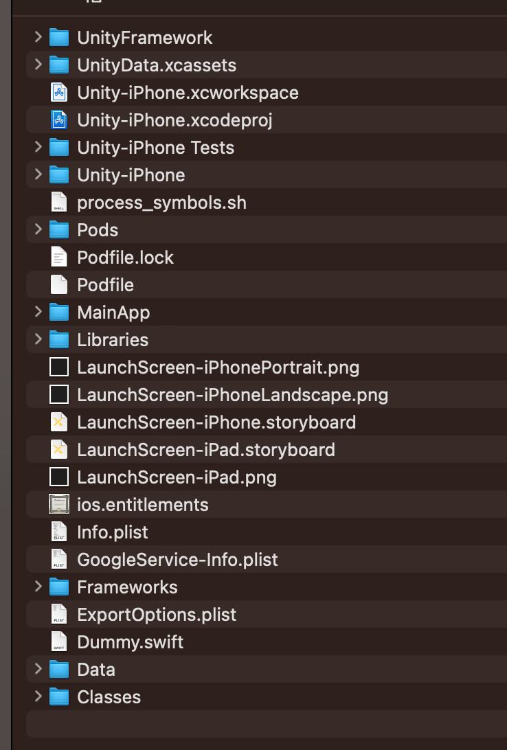 그러면 처음 스크린샷처럼 Pods 폴더와 Unity-iPhone.xcworkspace 파일이 생성되어 있다.