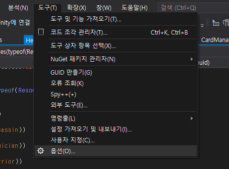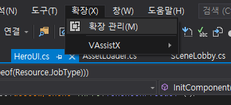 비주얼 스튜디오의 확장 메뉴를 누르면 위 스크린샷과 같이 확장 관리 라는 메뉴가 보인다.