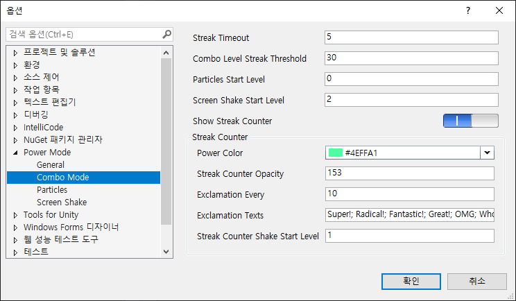 기본적으로 파워 모드의 기능 On/Off 선택 외에 콤보 모드, 파티클 이펙트 보이기, 화면 흔들기, 사운드 등의 On/Off 를 제공하며 각 기능들의 세세한 설정도 해줄 수 있다.