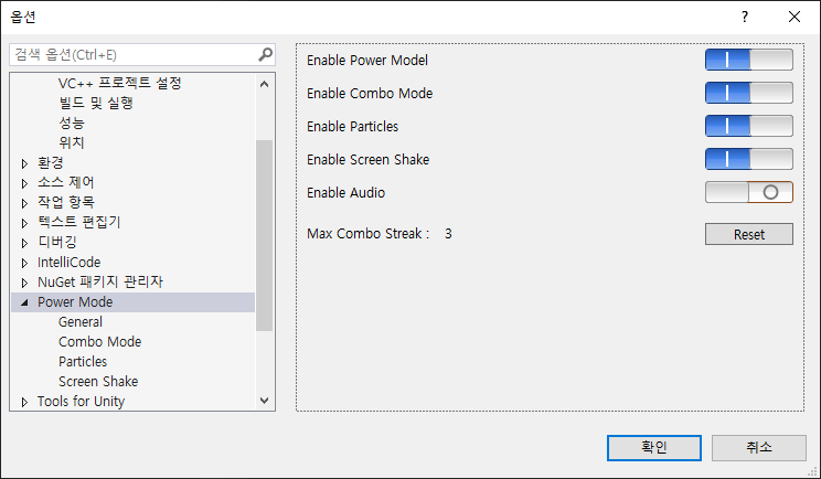 옵션창에서 스크롤을 내려보면 위와 같이 Power Mode 가 추가 되어 있다.